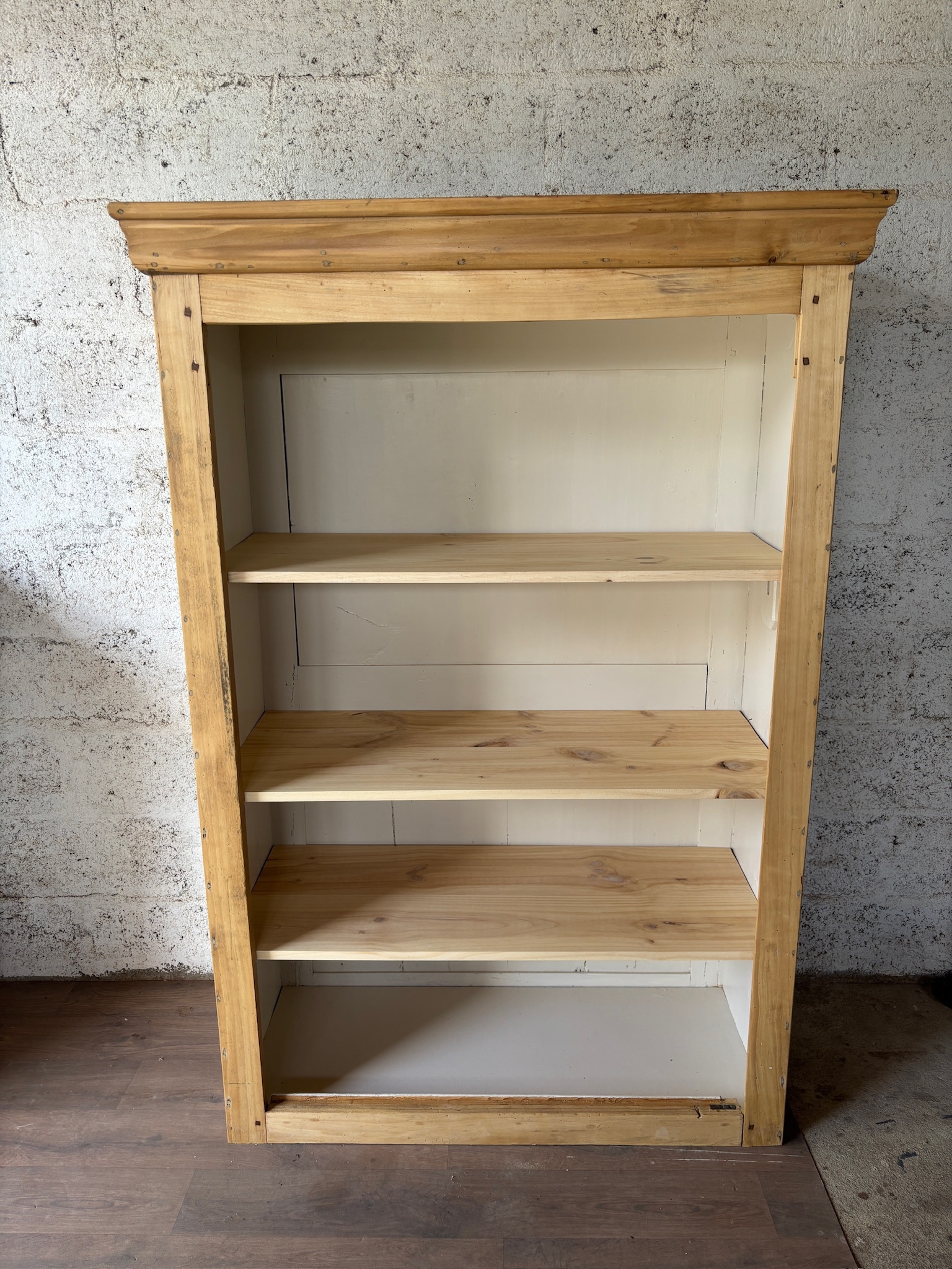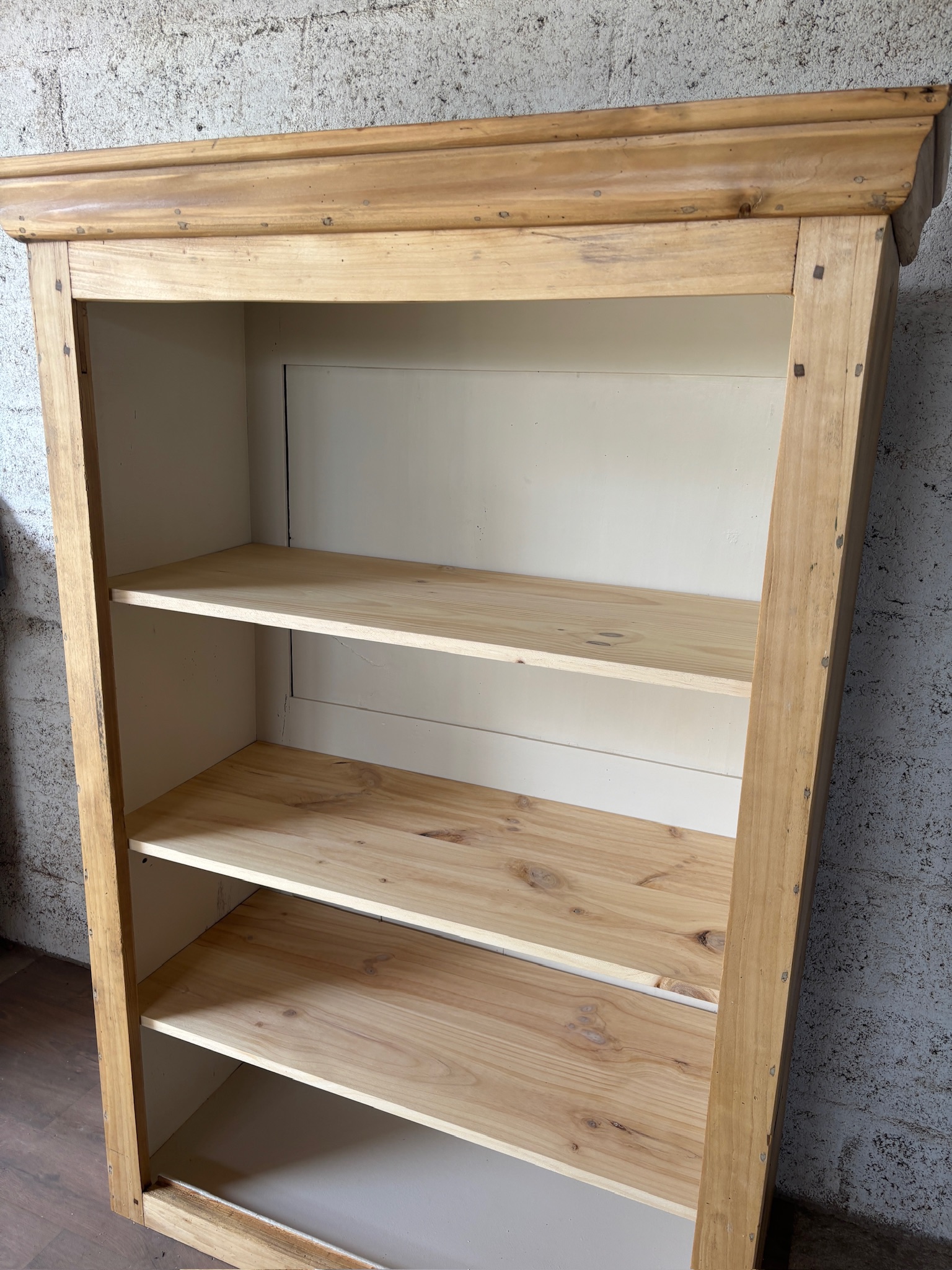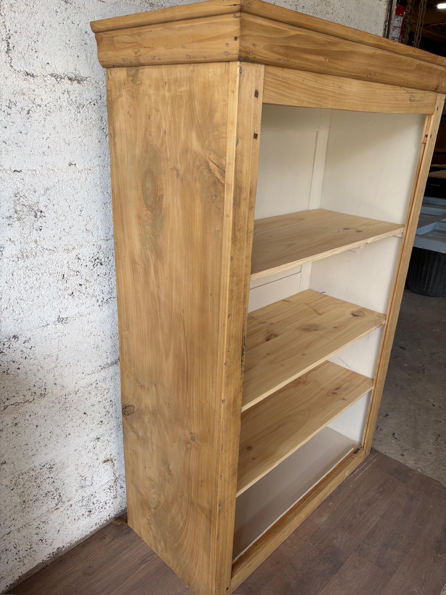 Bois entièrement poncé puis protégé avec une finition incolore, qui met en valeur le veinage et le charme d’origine.