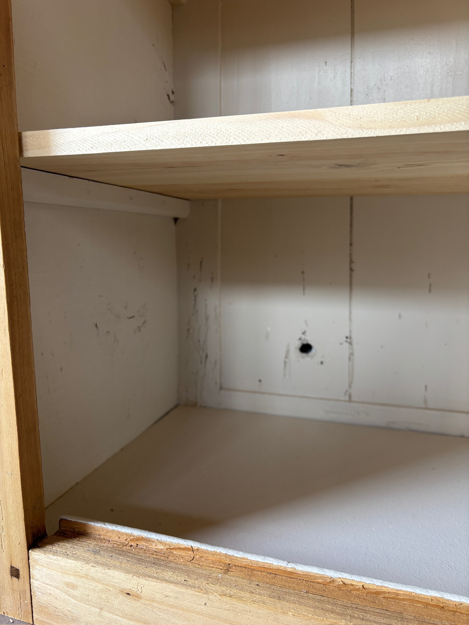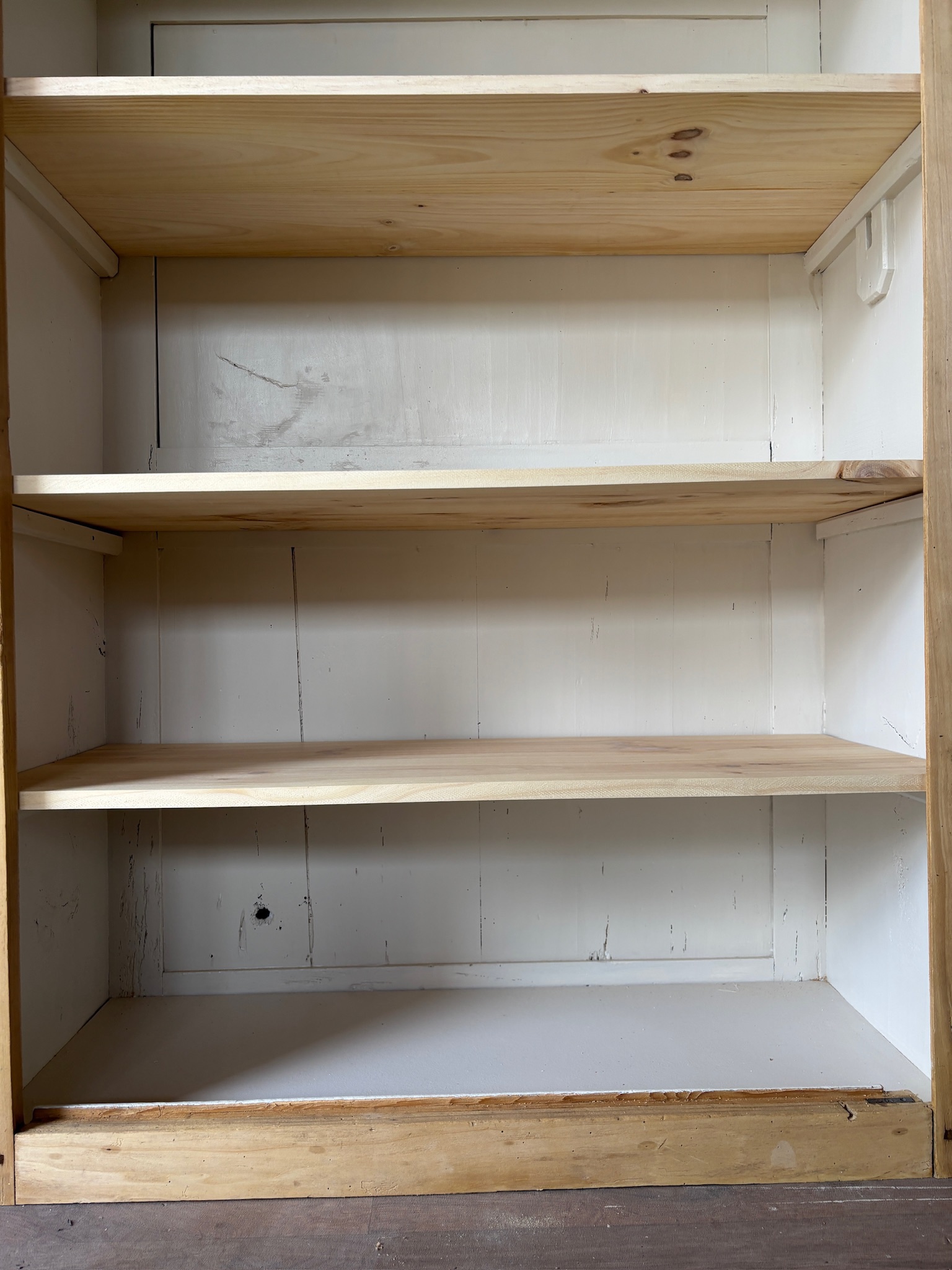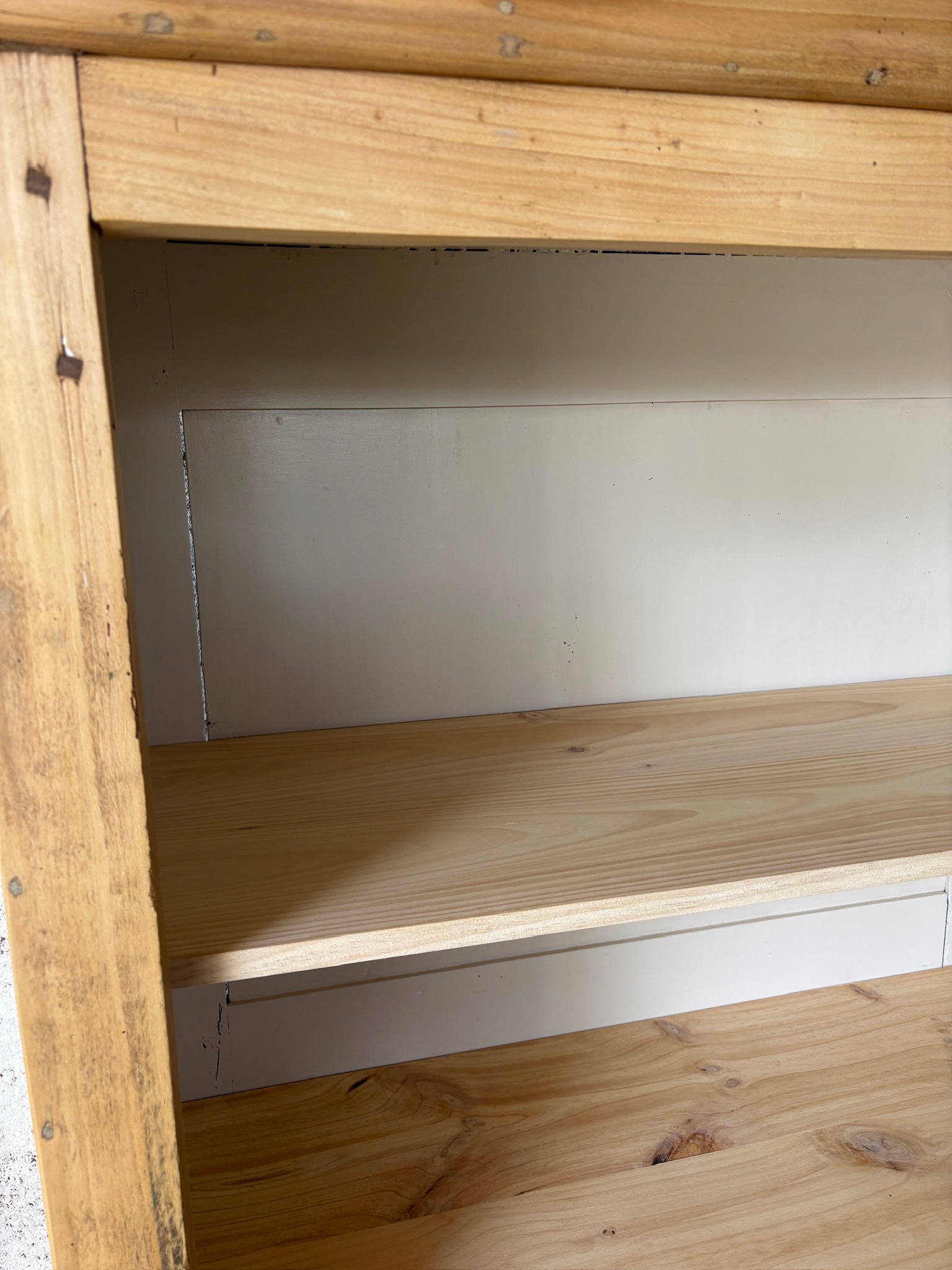 Bois entièrement poncé puis protégé avec une finition incolore, qui met en valeur le veinage et le charme d’origine.